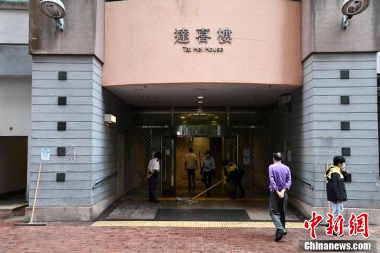 4月16日,香港秀茂坪宝达邨达喜楼5楼有单位凌晨发生火警,消防员接报后赶赴现场把火扑灭。火灾致4人死亡2人受伤。早上,消防员及警员于达喜楼继续调查事件。图为发生火警的达喜楼,有清洁员清洁住宅大堂的积水。中新社记者 李志华 摄