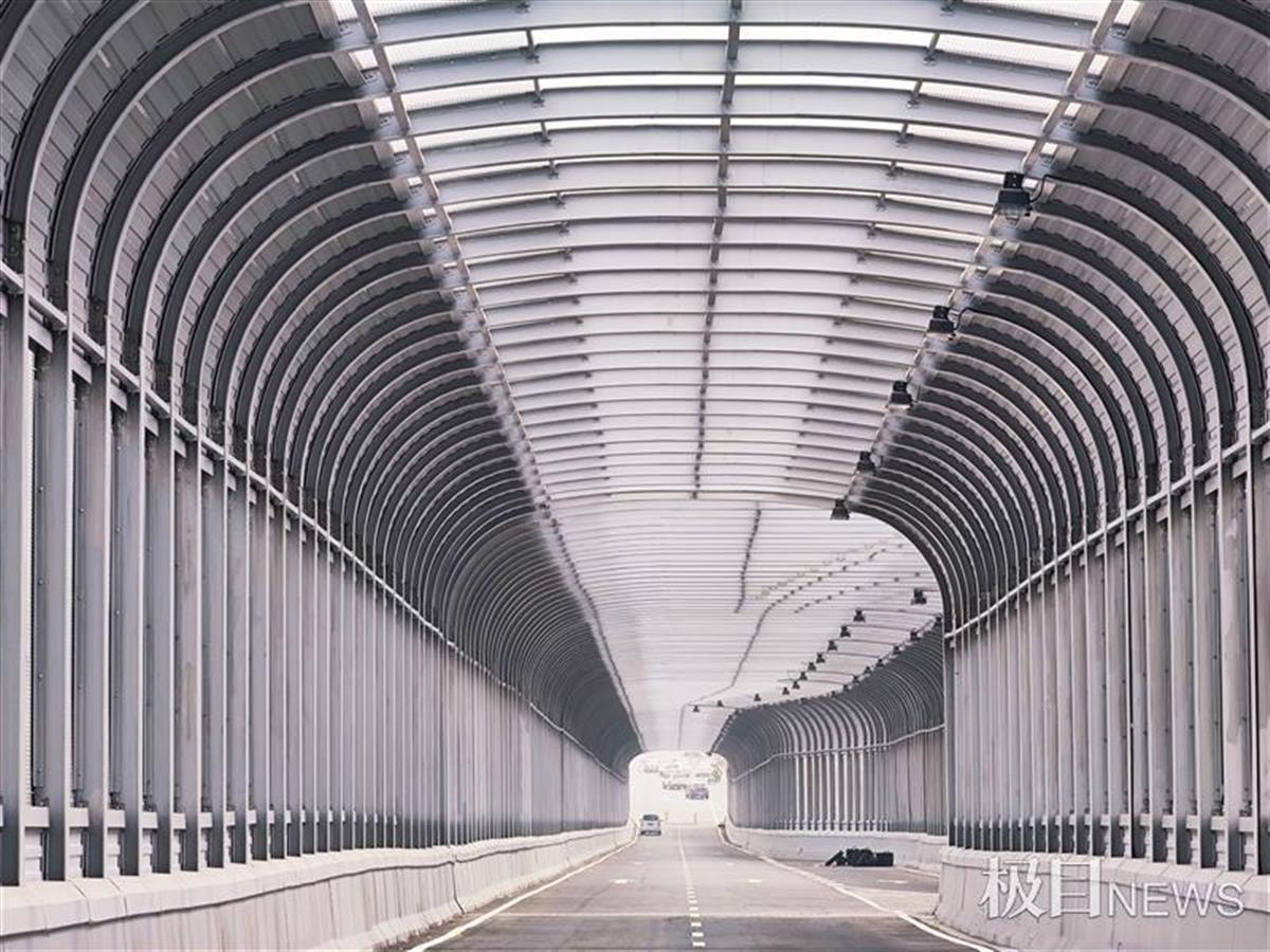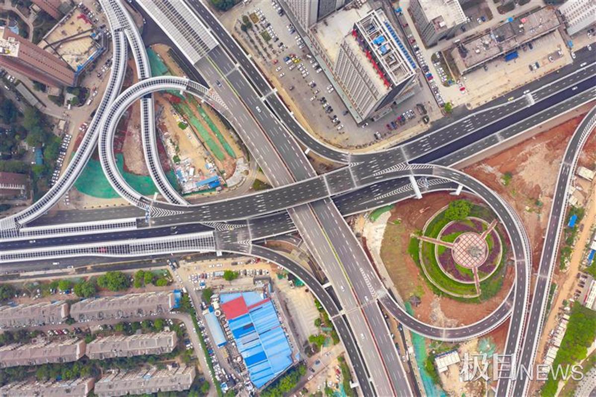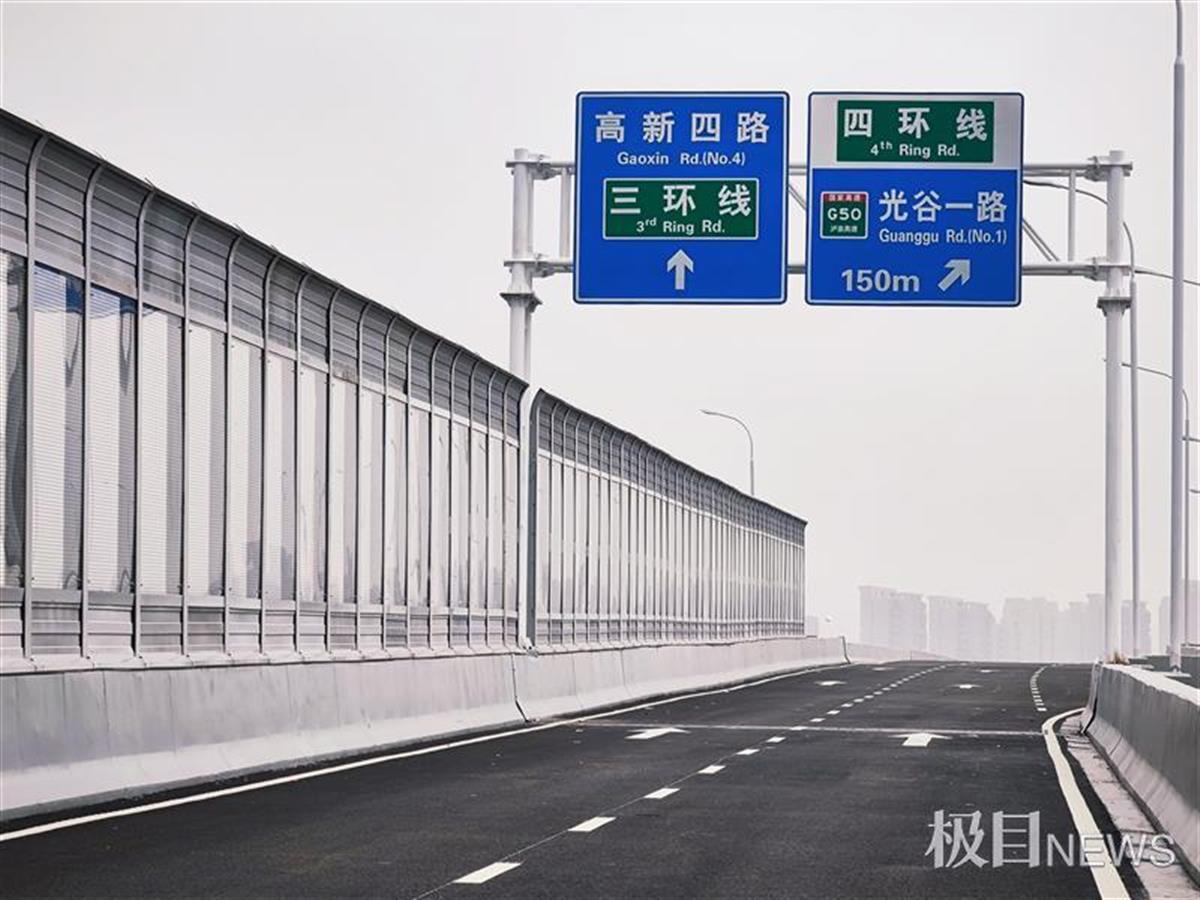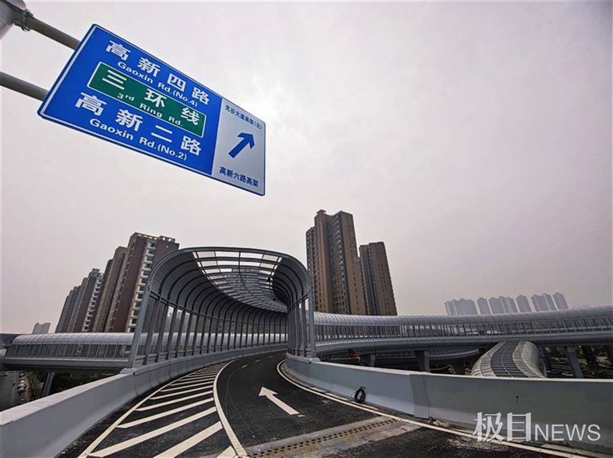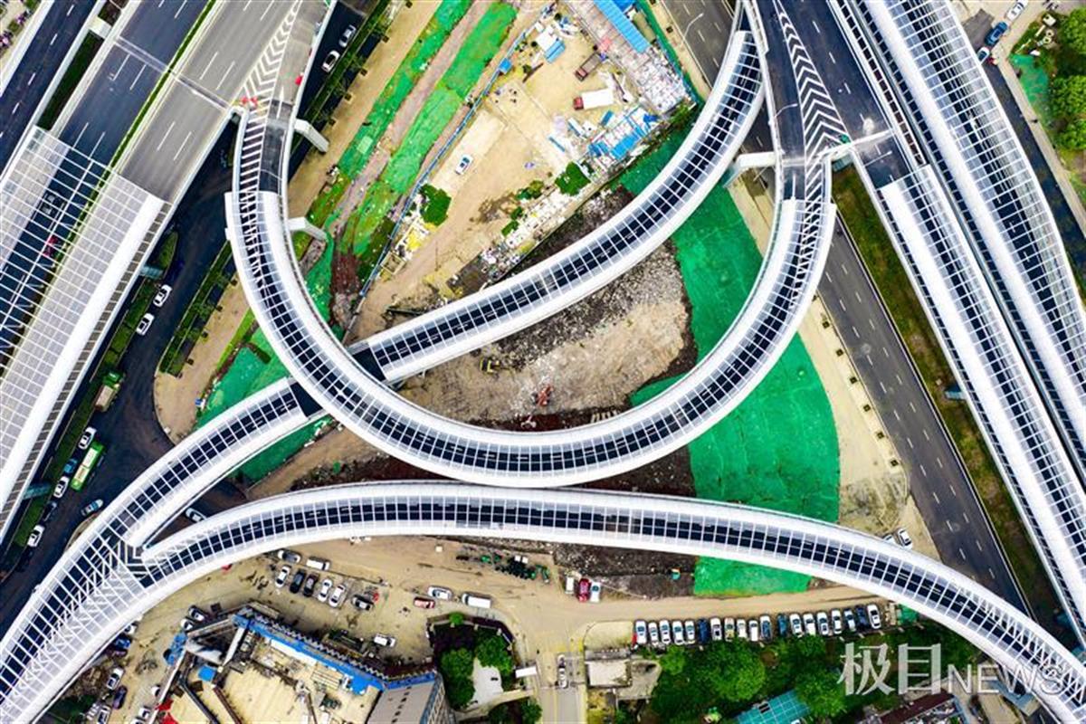 4月16日,从空中俯瞰,武汉光谷大道高架高新六路全互通立交就像一个巨大的“8”字,环抱着藏龙岛地标九凤台。极目新闻记者在现场看到,多条匝道的声屏障已安装完成,交通标识、路灯等附属设施也已安装到位。