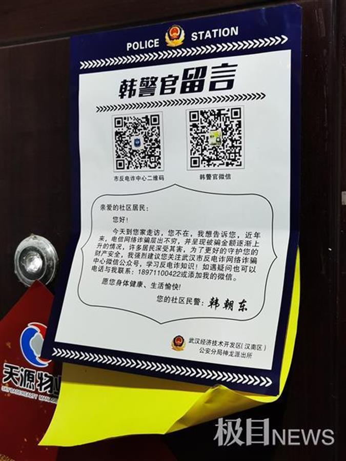 遇到住户不在家怎么办,当天的“扫楼”行动中,经开区警方还特意制作了便民留言条,为了方便群众取阅,警方特意将留言条制作成易粘贴、易取下的不留痕便利贴,既美观又实用。在留言条上,居民群众可以通过手机扫一扫关注反电诈有关宣传提示,遇到情况还可以随时随地向所在社区的民警咨询求助。在当天的行动中,各工作队跑遍万达广场全部写字楼的每一层楼,为了抢抓时间,确保全覆盖,不少民警、网格员干脆爬起了楼梯,尽管大汗淋漓,但是只要能够多向一名群众宣传普及反诈知识,少一个人被骗,大家就觉得这样的辛苦是值得的。