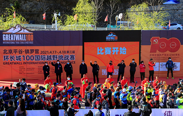 人民网北京4月19日电 (记者杨磊)4月17日8时,第三届环长城100国际越野挑战赛在北京市平谷区镇罗营镇玻璃台村开赛。区委书记王成国宣布比赛开始,800余名越野跑运动员开启了百公里越野征程。