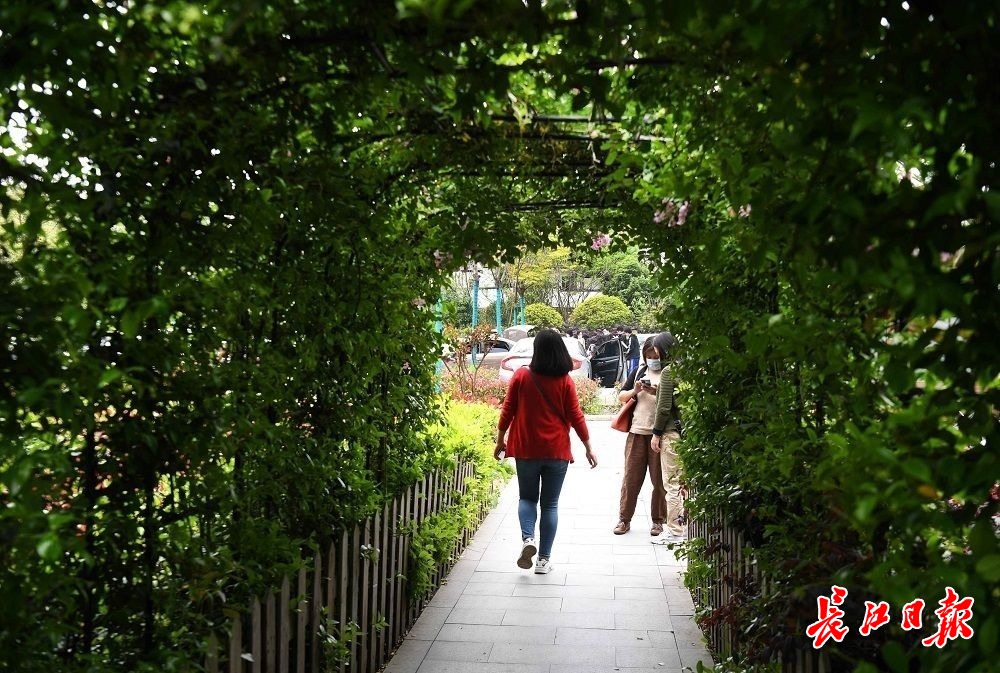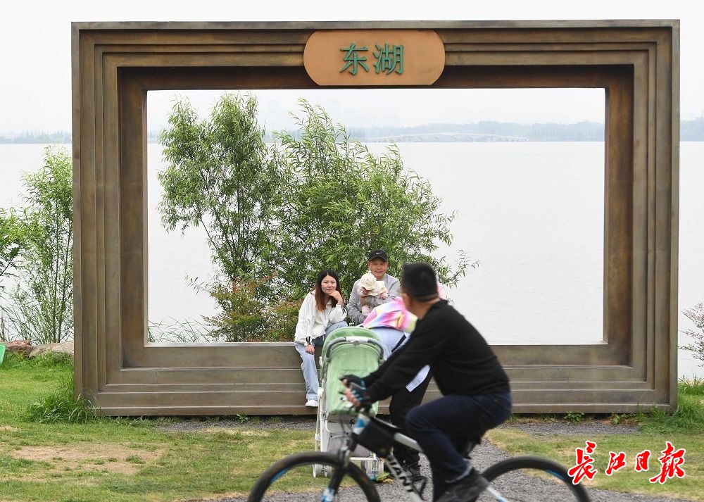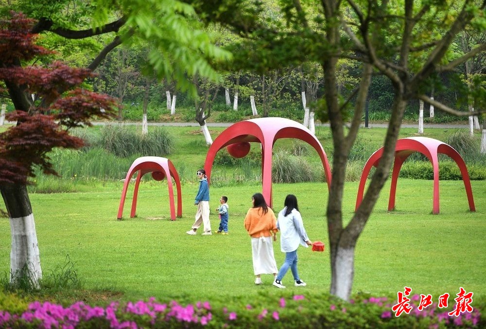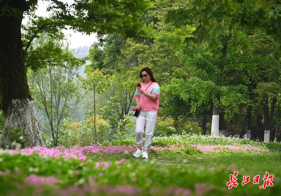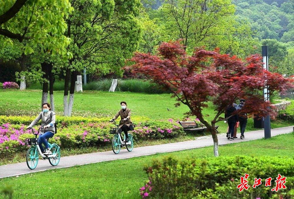 4月19日,东湖绿道森林道上绿草如茵,绿化带上鲜艳的杜鹃花、月季花和酢浆草等花卉竞相开放,人们徜徉在万紫千红的绿道花海中。