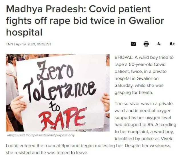 据《印度时报》19日报道,印度中央邦瓜廖尔一家私立医院发生了一起恶劣事件,一名男性医护人员两次试图强奸一名50岁的新冠肺炎患者,而当时这名女性患者还在吸氧。