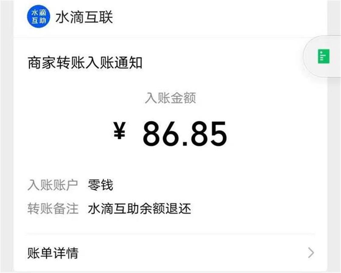 今年3月底,汉阳胡女士的微信收到两笔来自水滴互助的商家退款通知,金额分别为21.09元和6.34元。胡女士说,自己给家里人都购买了水滴互助,想着每个月缴纳很少的钱就能享受大病保障。她查看水滴互助平台发布的声明得知,原来平台面临关停,关停原因是业务升级,往期费用不返还,对于用户账户内的余额,平台在公告发布5日内发起退款,并赠送在保用户一份保障期1年的保险产品。