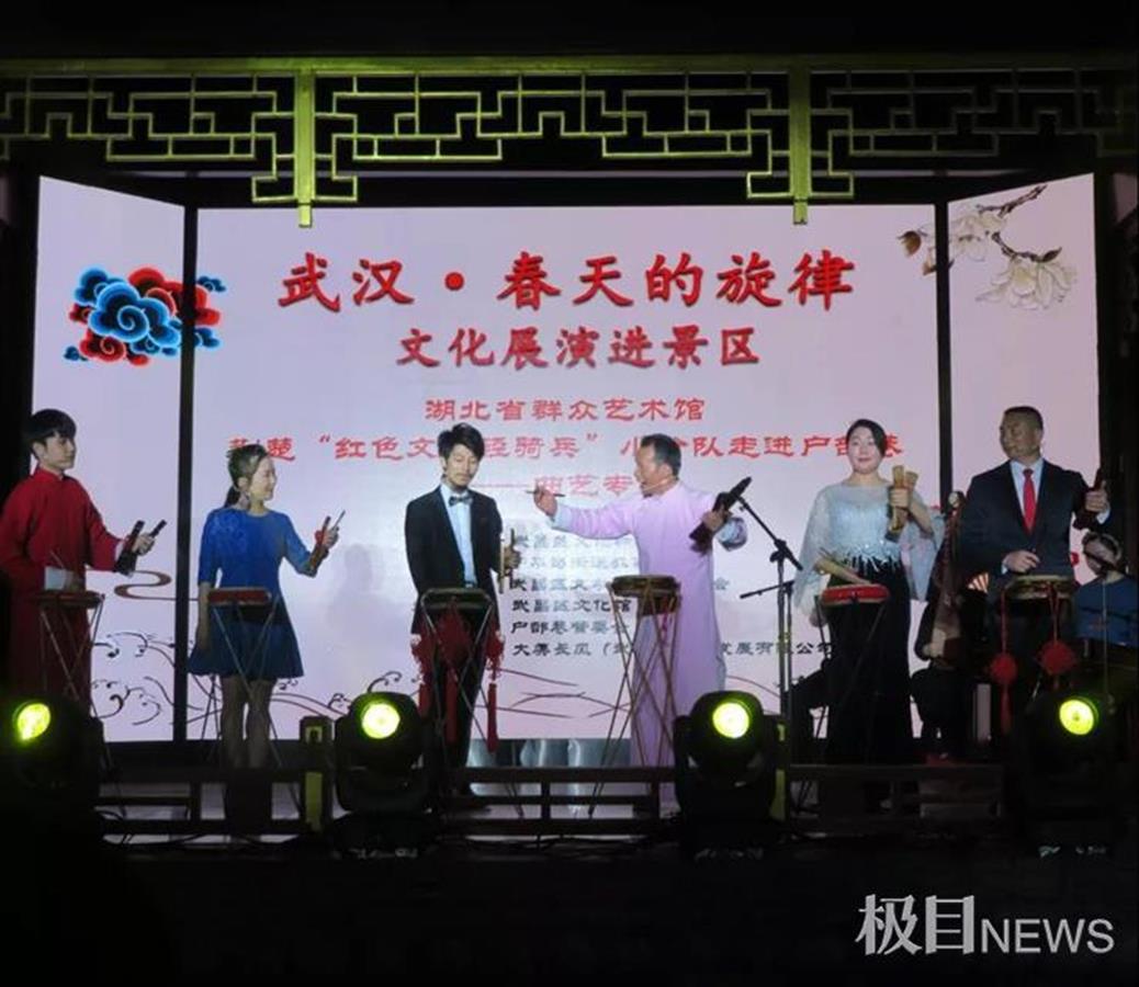 演出现场,国家一级演员、湖北大鼓国家级非遗传承人付群刚携弟子登台表演的湖北大鼓《下里巴人也风流》吸引大批游客驻足观看,郑博杰、程晓斌、卢海燕、胡威等分别带来的湖北大鼓《撸起袖子加油干》《重温入党誓词》《原来如此》,曲艺演员刘雄、林圣带来的相声《笑语欢歌》,车鹏带来的快板书《三打白骨精》,同样赢得笑声不断。而由付群刚、徐颖、刘雄表演的《人民调解员》,这一曾摘获“全国群星奖”的湖北大鼓节目压轴登场,让现场游客在手捧地道美食热干面、糊汤粉等等之余,更能亲身感受到湖北文化特色的魅力。