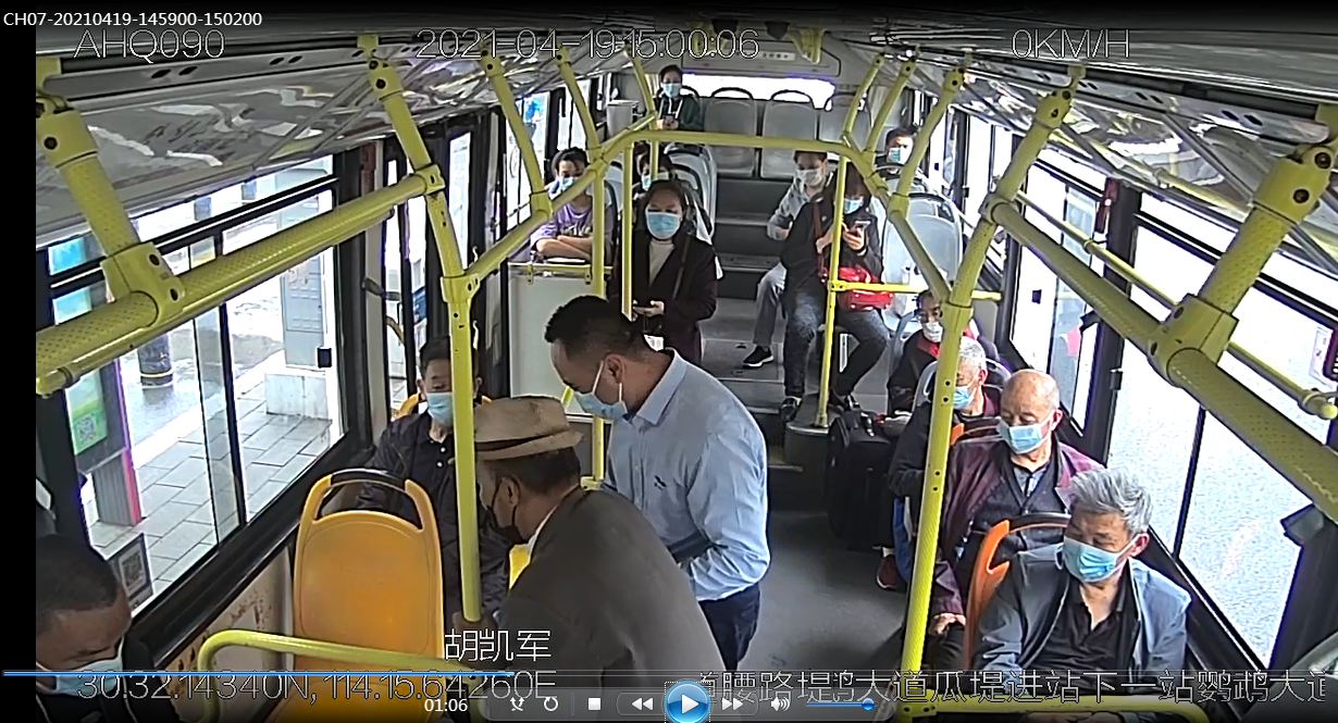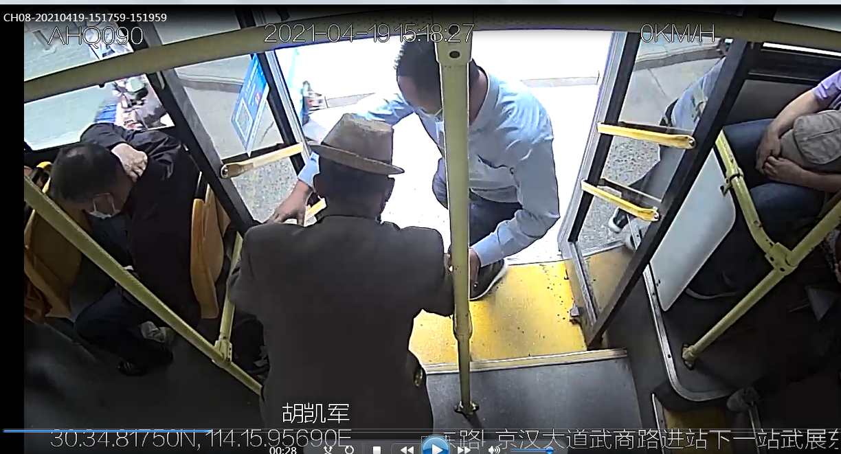 15时18分,当车辆驶入京汉大道武商路时,胡凯军将车靠边停至安全地方,再次来到老人身旁,将爹爹安全搀扶下车,老人连声致谢,他才上车继续投入营运。