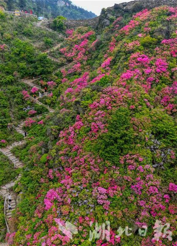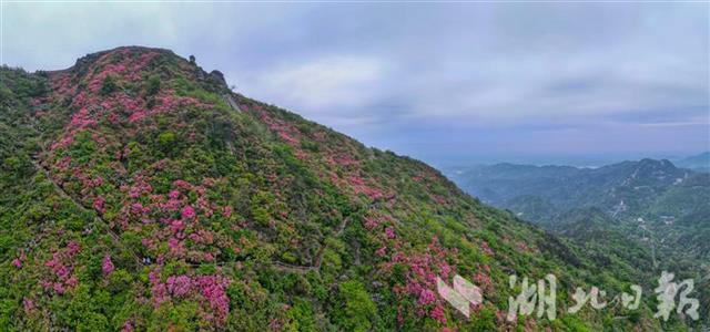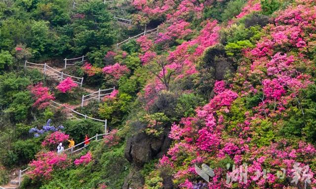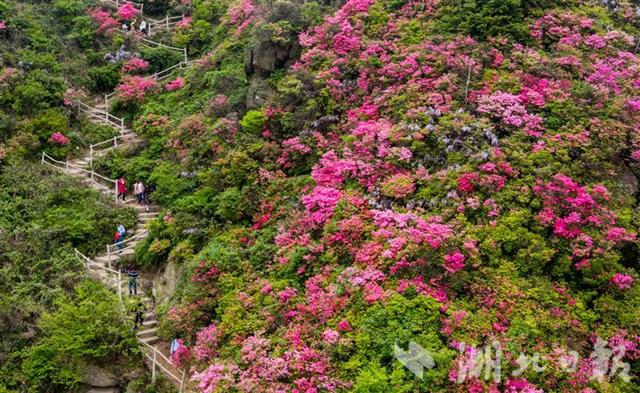 2021年4月20日,游客在武汉木兰云雾山景区畅游杜鹃花海。云雾山地处武汉“后花园”黄陂木兰文化生态旅游区,是全国著名的杜鹃花研究基地。每年4月,景区万亩野生杜鹃盛开,漫山花朵染红山麓,壮美景色令人沉醉。(湖北日报全媒记者 柯皓 通讯员 邱舒 摄)