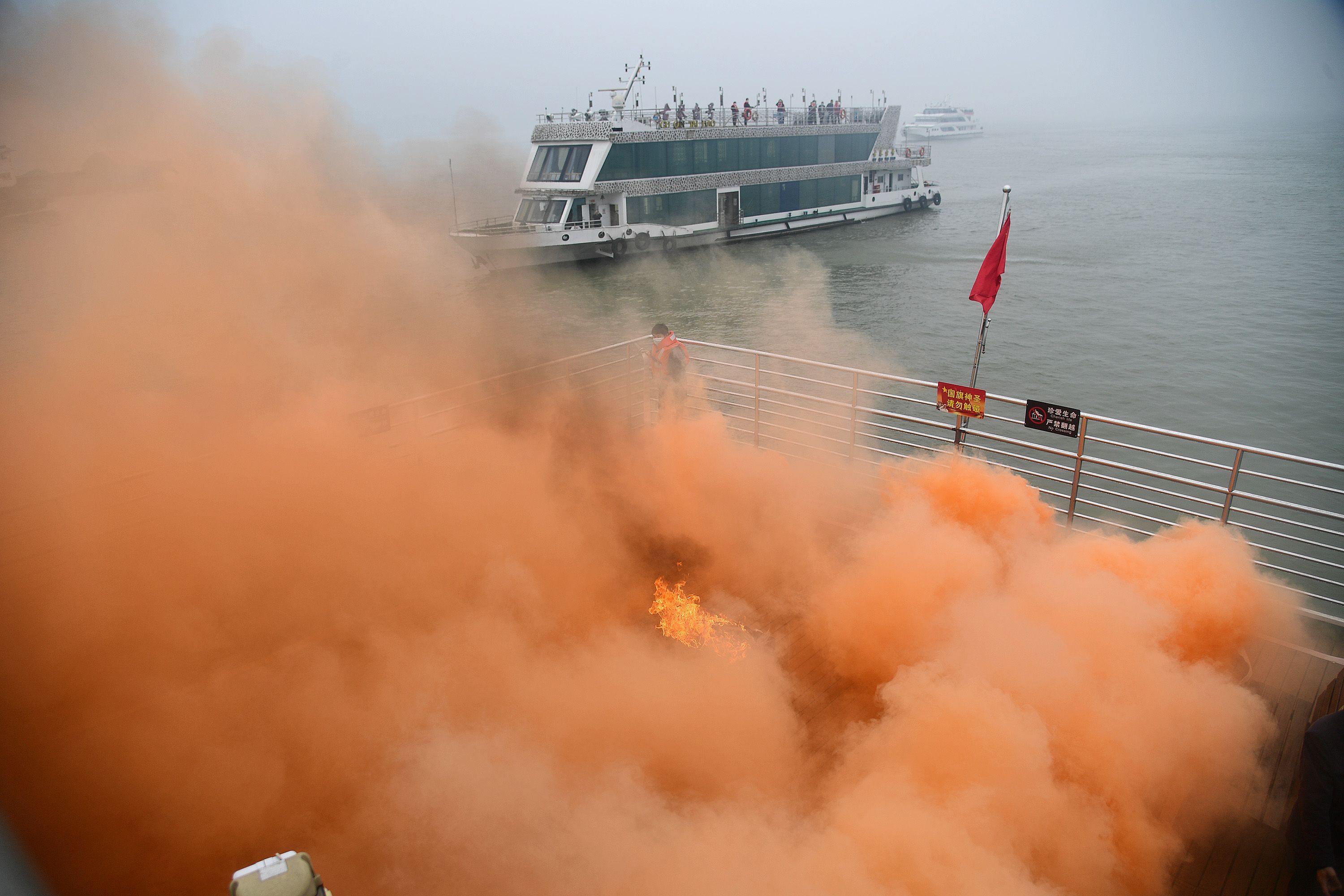 上午10时,随着演习总指挥一声令下,演习正式开始。本次模拟事故船“江城5号”载客100人,由武汉轮渡武汉关码头开往武汉轮渡月亮湾码头,航行至月亮湾码头水域时,由于一名乘客隐藏携带的一瓶柴油不慎引燃, 造成火情。危急时刻,“事故船”全体船员按照《应变部署表》职责划分紧急启动火警按钮,并利用本船配备的消防设施进行控火、灭火。乘客被全部疏散至安全区域一层甲板。同时,船长通过甚高频无线电话向海事等相关部门报警。几分钟后,在附近接收到协助命令的船舶火速赶赴到“事故船”两侧进行协助灭火、转移乘客和受伤乘客。20多分钟的协同配合,演练船舶和相关工作人员顺利地完成了火险应急、抛锚演习、乘客疏散、伤员转运4个演习科目。