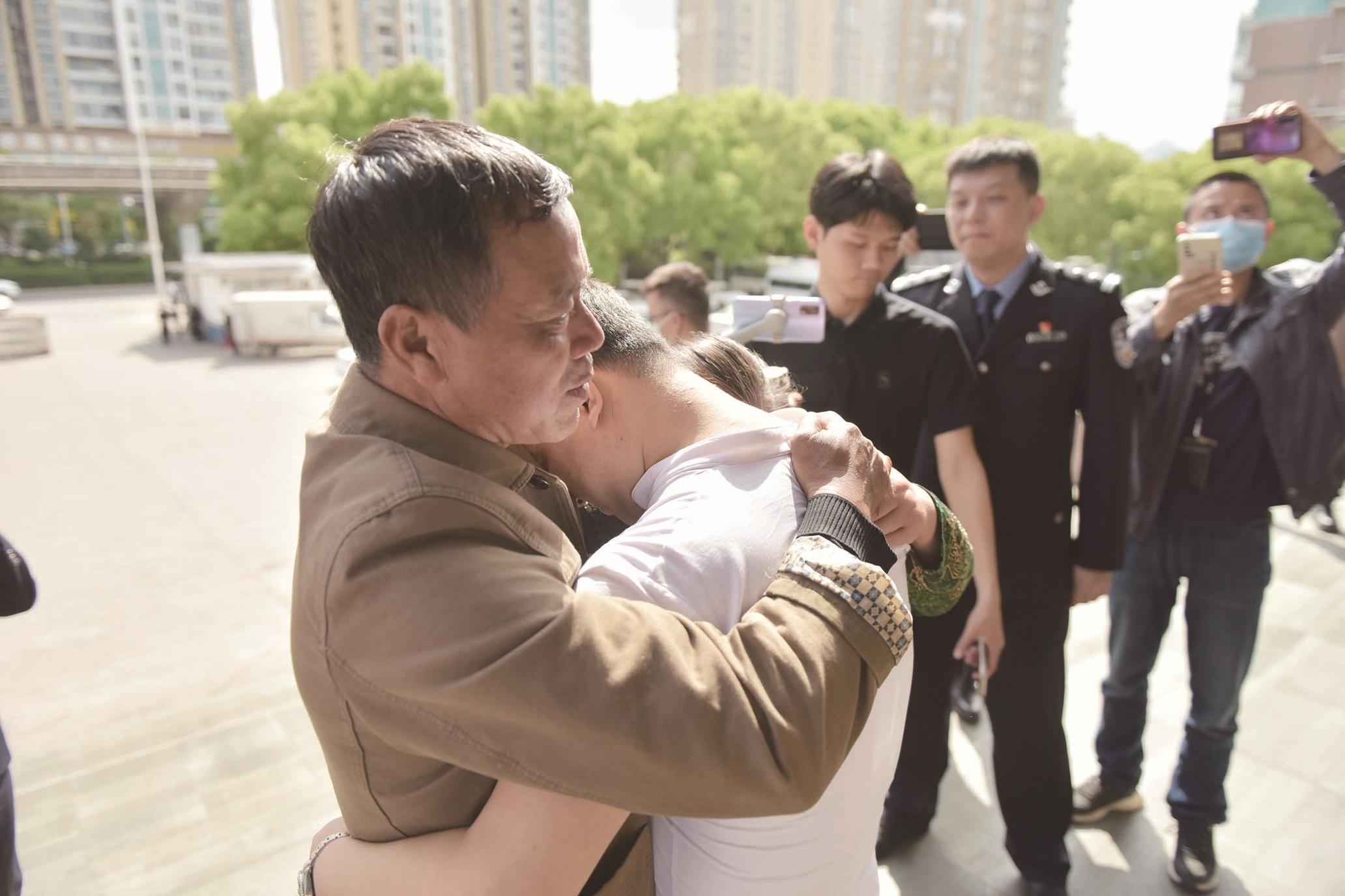 陈建平没有哭出声,却在不停地抹泪。他扬起双手,一把将妻儿揽入怀里,停顿了上10秒才松开。