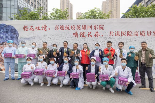 长江日报4月23日讯 “我们从祖国大陆最南端带来了甜美的水果——徐闻菠萝,向英雄武汉致敬,向英雄的武汉医护人员致敬。”4月23日上午,来自广东省徐闻县的100箱菠萝送到了武汉大学人民医院东院区医护人员手中。