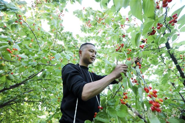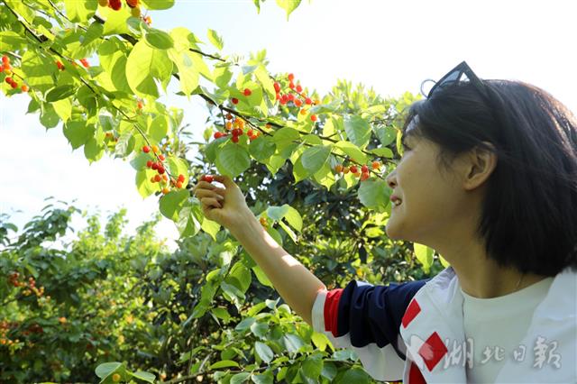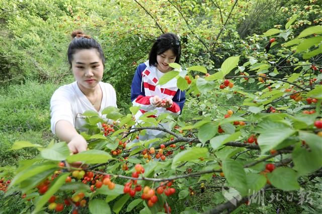 4月22日,游客在十堰市房县城关镇八里望小流域樱桃基地采摘樱桃。“房县樱桃”获得国家农产品地理标志认证。该县开发创新樱桃野外栽培新技术,发展果实大、产量高的“庐陵王”“八里旺”大樱桃,樱桃果存储期提高一倍,促进了农民增收。目前,当地樱桃销往北京、上海、广东等地,省内10个市州(区)引种房县樱桃,樱桃产业年实现综合收益突破3亿元,已带动2000余户农民增收致富。(视界网 张启龙 刘凤 摄)
