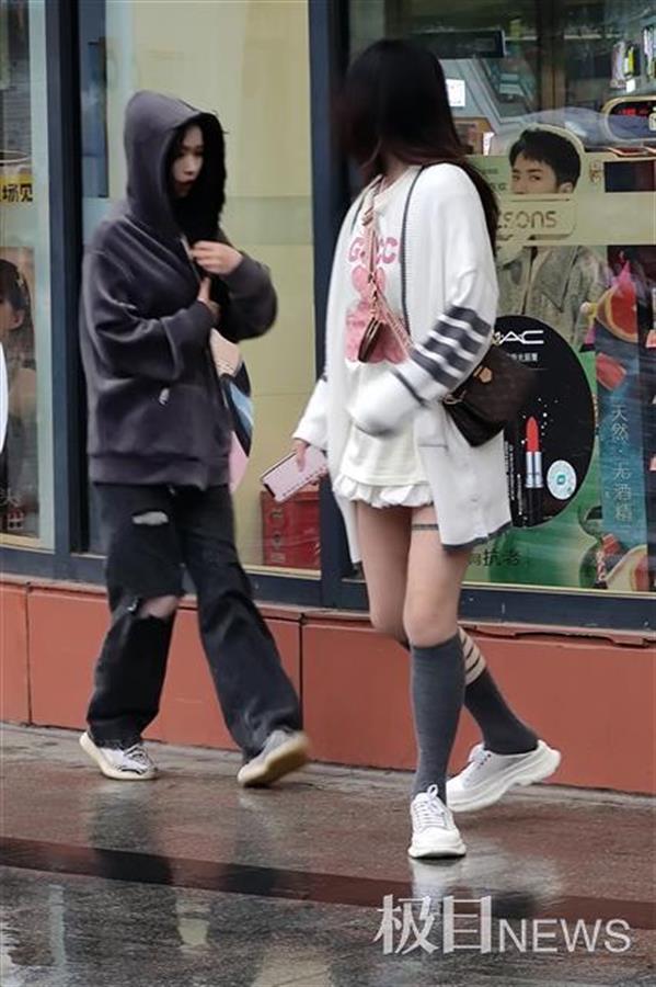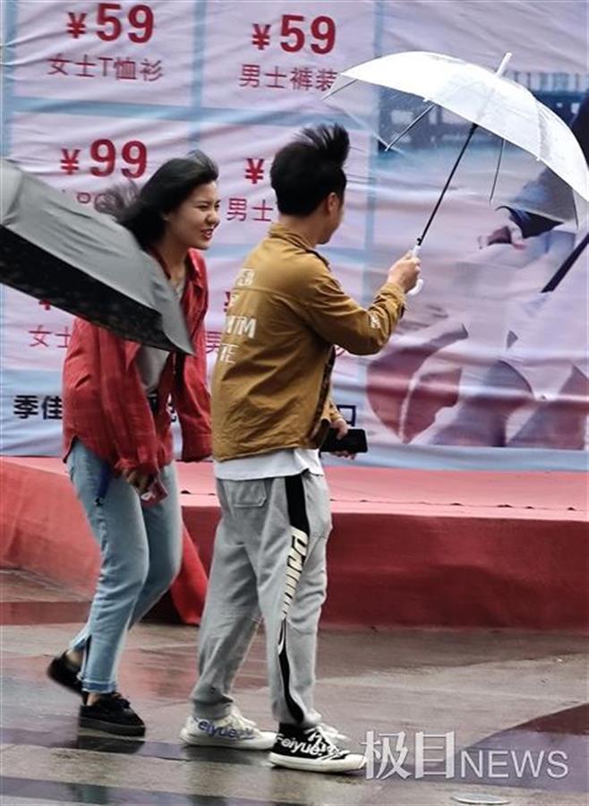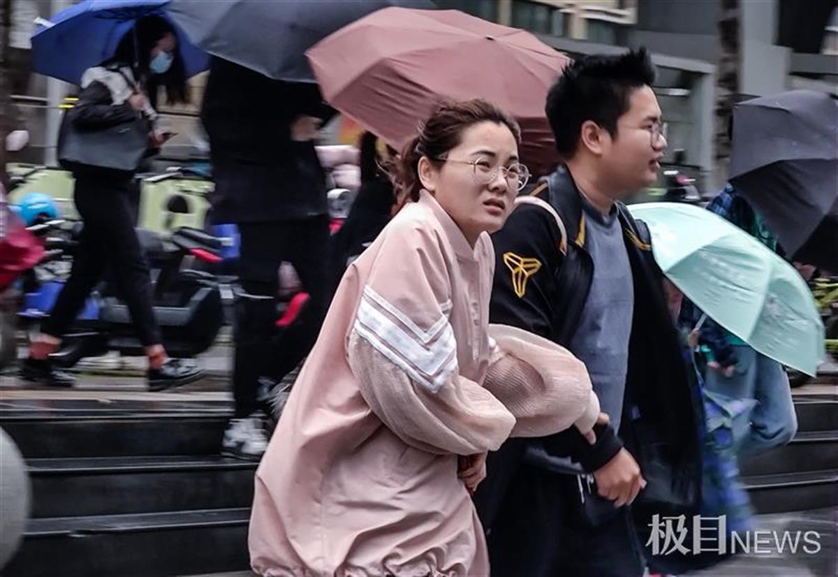 当时气温已降到了14℃,小雨携风,让人体感温度更低,行人加快了出行了步伐。
