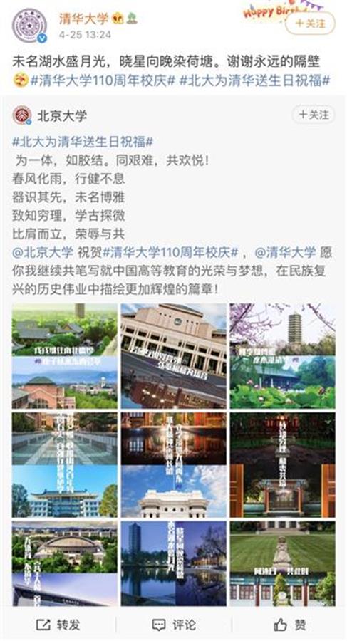 要说与清华大学关系最特别的中国高校,非北京大学莫属。在“邻居”过110岁生日的特殊日子里,北大花了不少心思,在微博上推出了9张设计感极强的图片,用“桃李灿博雅,水木湛清华”等9句话道尽北京大学和清华大学的情谊,更在微博上写道,“为一体,如胶结。同艰难,共欢悦!”