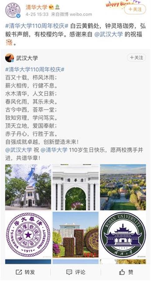 历史悠久的武汉大学为清华送上的贺词为,“百又十载,栉风沐雨;薪火相传,行健不息。水木清华,人文日新;春风化雨,其乐未央。古今中西,荟萃一堂;致知穷理,学问笃实。顶天立地,爱国奉献;赤子丹心,行胜于言。自强成就卓越,创新塑造未来!武汉大学祝清华大学110岁生日快乐,愿两校携手并进,共谱华章!”