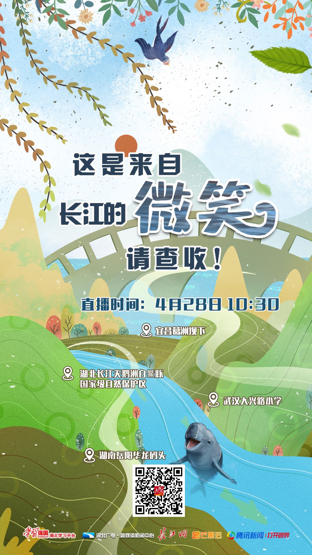 别走开,4月28日第5场直播马上开播,3个直播点3路记者带我们寻找“长江微笑”江豚。2小时的直播,观众可以欣赏到石首、宜昌和武汉江豚的美丽身姿。精彩不容错过哦!