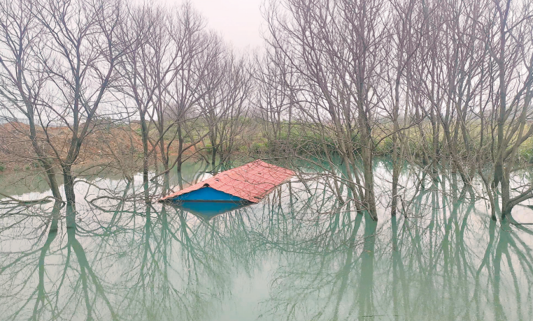 顺着一条泥泞小路走上一个小坡,只见一片约200平方米的水潭出现在眼前。淡绿色的水体中间半露着一个红瓦屋顶,几株大树生长在水中。水潭边低洼处,清澈的泉水,源源不断,顺着地势流淌,下方已形成一条小河。“过去,这里的地势较低,泉眼可见,汩汩有声。”前锋村村民、50岁的阎汉云告诉记者,由于这处泉眼周边地势提高了,不断涌出的泉水逐渐淹没了井体,形成了这个水潭。曾经的井口,就在被淹没的房子里面。