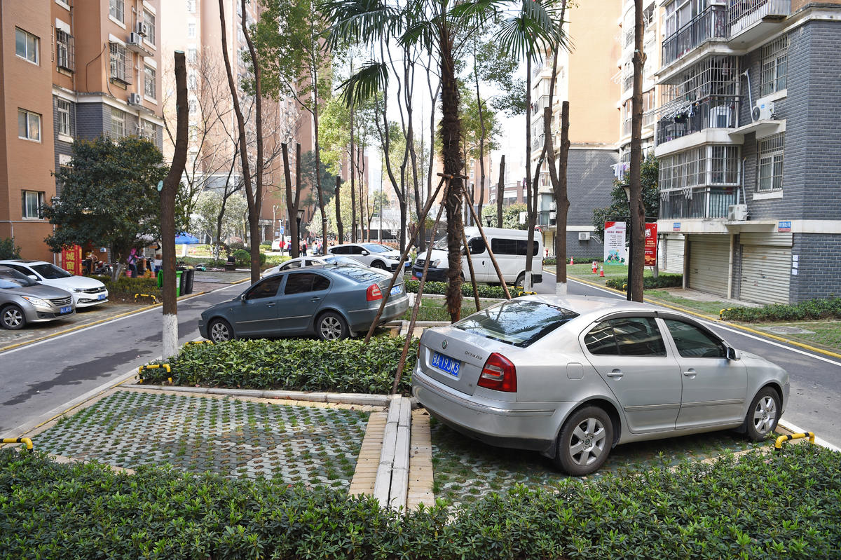 东湖新城社区,由绿化带改造成的生态停车场,不但缓解了社区停车难的问题,乱停乱放的现象也几乎不见。(湖北日报全媒记者 李溪 摄)