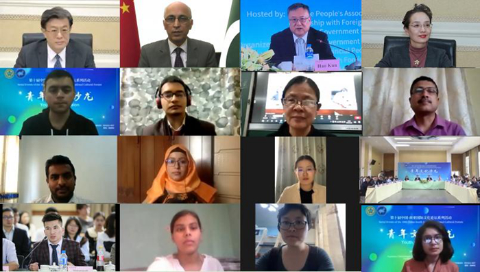 当日,来自中国和阿富汗、孟加拉、印度、尼泊尔、巴基斯坦、斯里兰卡等南亚6国的大学生、媒体和友好组织青年代表20余人以“传承丝路精神、展望亚洲未来”为主题,进行深入交流。中国和南亚各国有关机构和大学近200人在线旁听。