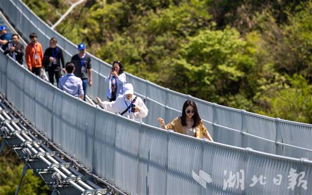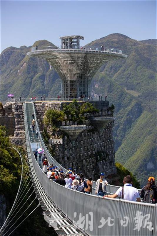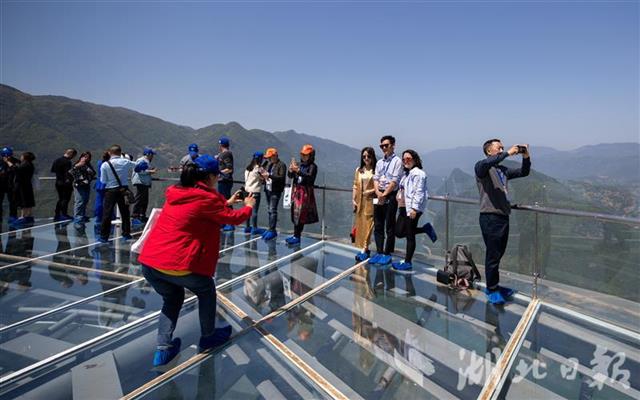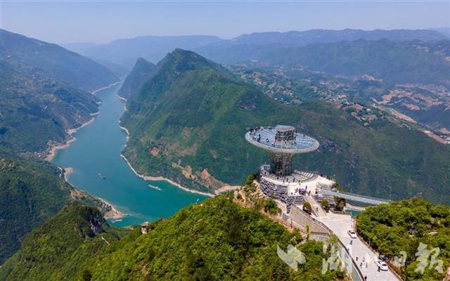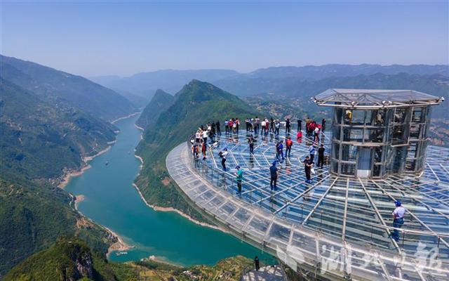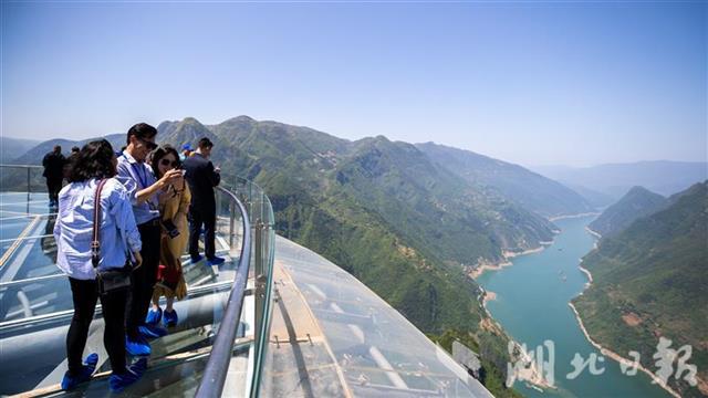 2021年4月30日,在巴东县巫峡口景区,游客登上观景平台,俯瞰峡江。