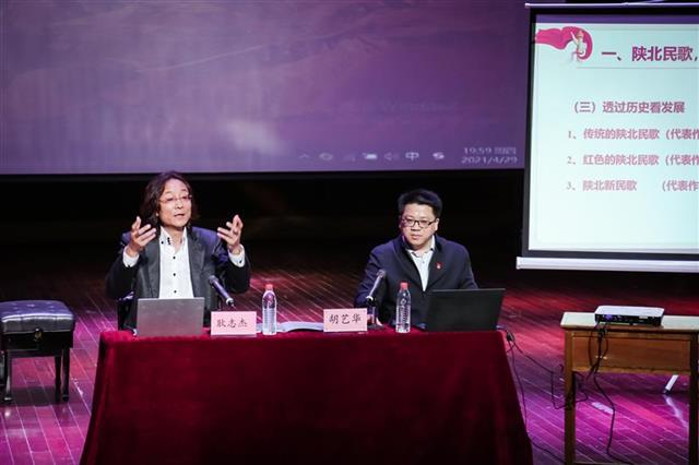 湖北日报讯(通讯员张郁)“以百年党史的宏阔视野来深入挖掘陕北民歌的红色基因,以陕北民歌的艺术载体来生动传唱百年党史的经典故事”。4月29日晚上7点,一场别开生面的音乐党课在武汉音乐学院滨江校区黄钟音乐厅拉开序幕,知名音乐人、作曲家、陕北民歌专家耿志杰和武汉音乐学院马克思主义学院院长、教授、武汉大学在站博士后胡艺华联袂登台,共同主讲音乐党课“百年党史与陕北民歌”。研究生部主任、教授张璟主持并致辞,相关部门负责人、教师代表以及研究生党员和入党积极分子共计100多人现场听课。