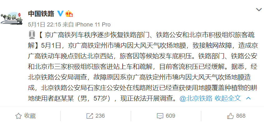 就“受大风影响京广高铁故障”一事,昨晚(5月1日)22时15分,@中国铁路 发布最新通报: