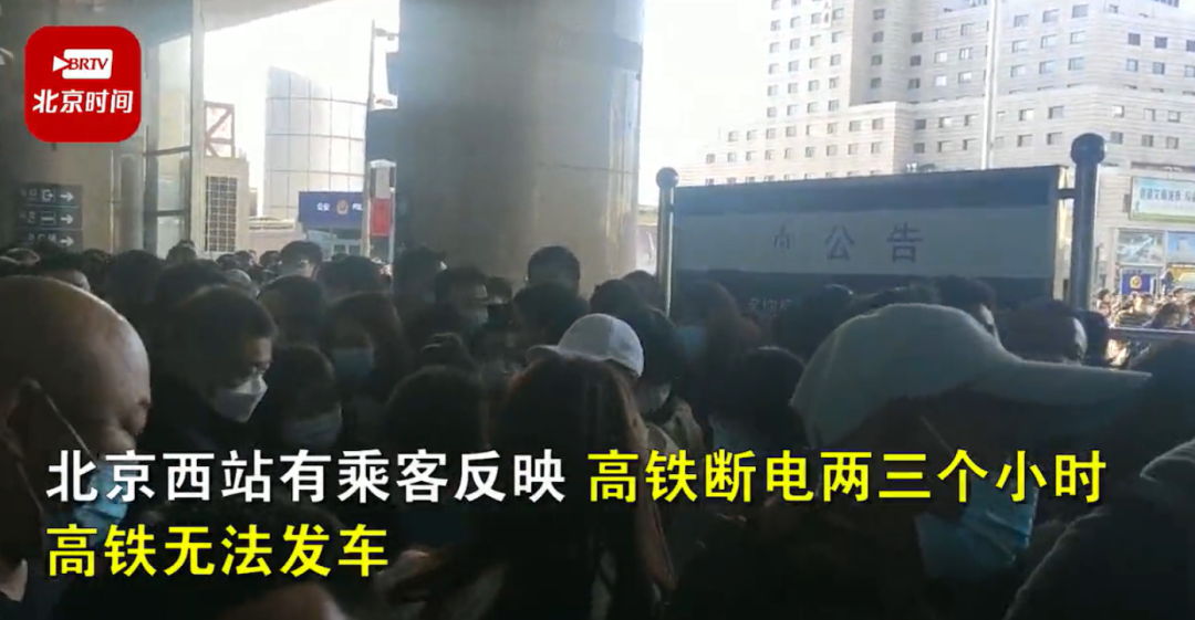 据@时间视频 5月1日下午18时许报道,5月1日,北京西站有乘客反映高铁断电两三个小时,高铁无法发车,大量乘客滞留在北京西站广场和检票口。