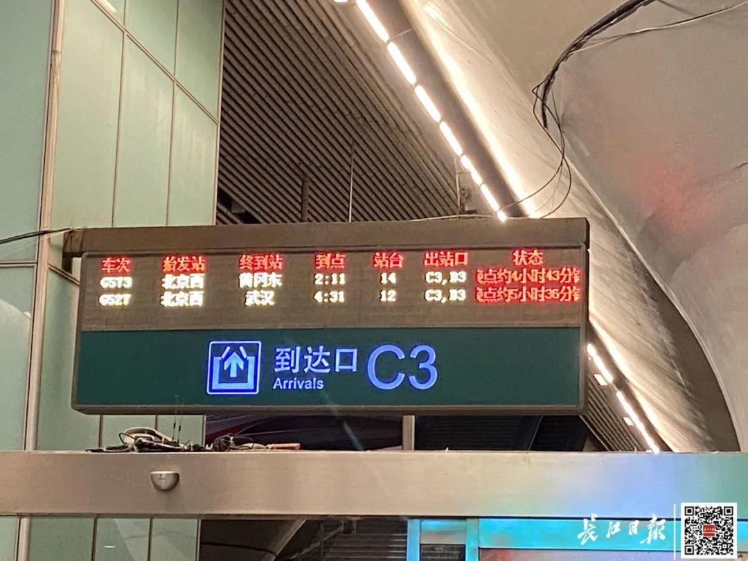 凌晨2时11分,由北京西开往黄冈东的G573次列车抵达武汉站,这趟车晚点4小时43分钟。记者在出口看到,有不少旅客乘这趟车到武汉。