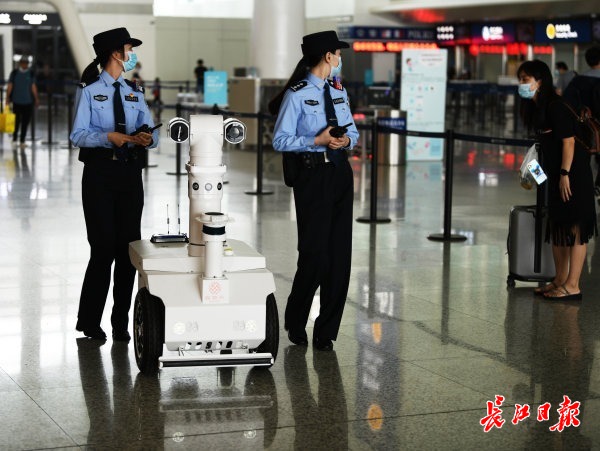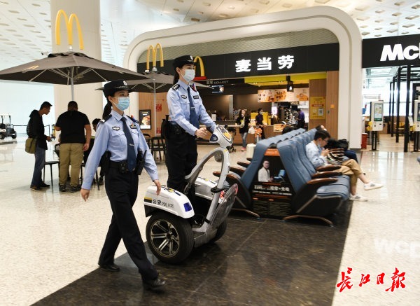 从早上8:30到下午5:30,张化雯、张紫薇便一直在机场候机厅、安检口、登机口等地不间断巡逻。为保障旅客出行安全和处置突发事件,她们上岗前尽量少喝水,减少上厕所次数。5公斤重的单警装备,徒步巡逻时间久了,双脚极易磨出血泡,她们便开上平衡车和远程揺控机器人巡逻。