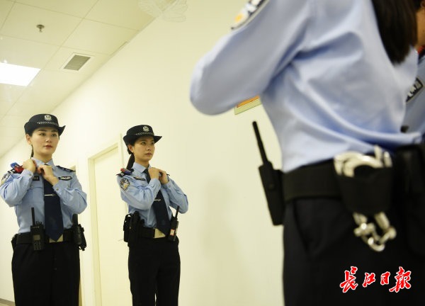 8:15,张化雯(左)、张紫薇(右)整理着装,准备上岗。