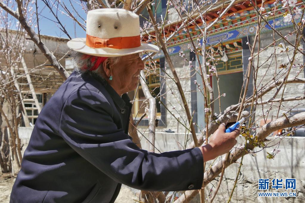 顿珠旺杰在修剪家里的桃树树枝(4月5日摄)。新华社记者 孙阳 摄