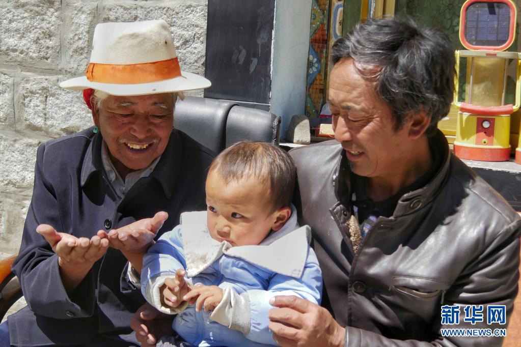 顿珠旺杰(左)和重孙玩耍(4月5日摄)。新华社记者 孙阳 摄