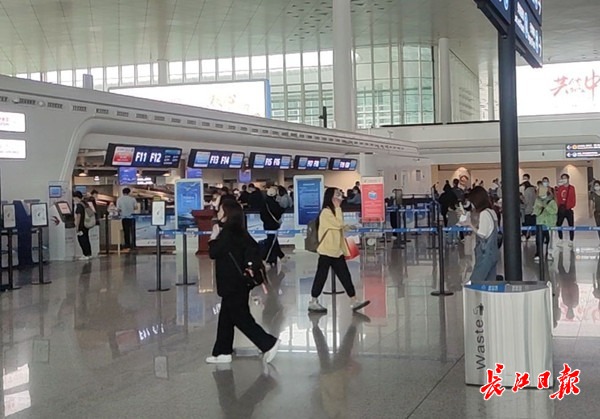 16时许,长江日报记者在天河机场离港大厅看到,旅客井然有序地排队换登机牌,在广播和工作人员引导下,常态化候机。