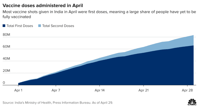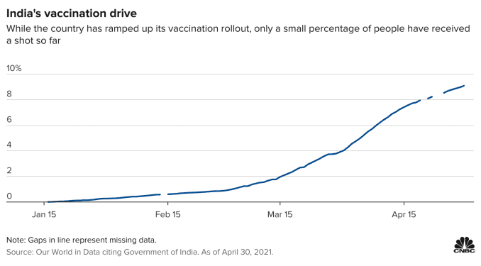 印度自今年1月开始进行大规模疫苗接种,目前仅有不到10%的成年人接种疫苗。