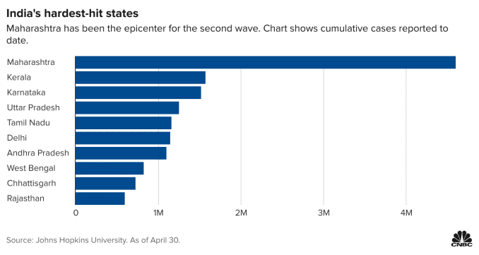 世界卫生组织上周表示,全球每三例新增新冠病例中,就有一例来自印度。简单的统计数据正说明了印度疫情的严重性。5月3日,美国消费者新闻和商业频道(CNBC)根据约翰斯·霍普金斯大学公布的数据(截止到4月30日)制作出五张表格,为印度疫情“何以至此”提供了视觉呈现。