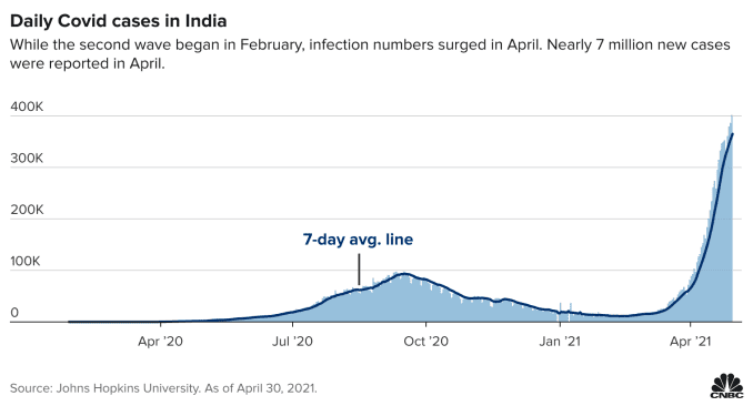 根据印度卫生部公布的数据,4月4日,印度日感染人数突破10万;4月14日,突破20万;4月21日,突破30万。4月21日到25日,每日超过30万。5月1日,印度单日新增新冠确诊病例首次超过40万例,连续10天超过30万例。有专家预测,到5月中旬,印度每日新增病例可能将高达50万例。