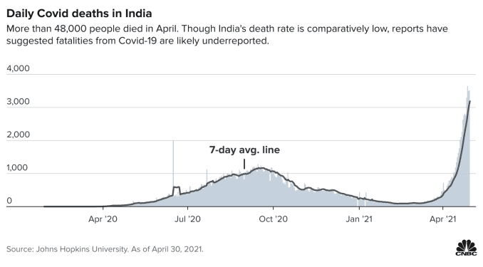 4月,印度新冠死亡人数超过4万8千例,虽然相对而言印度新冠死亡率并不高,但有报道称,印度新冠死亡人数被严重低估。CNBC指出,印度在今年4月报告的死亡人数超过了20万。