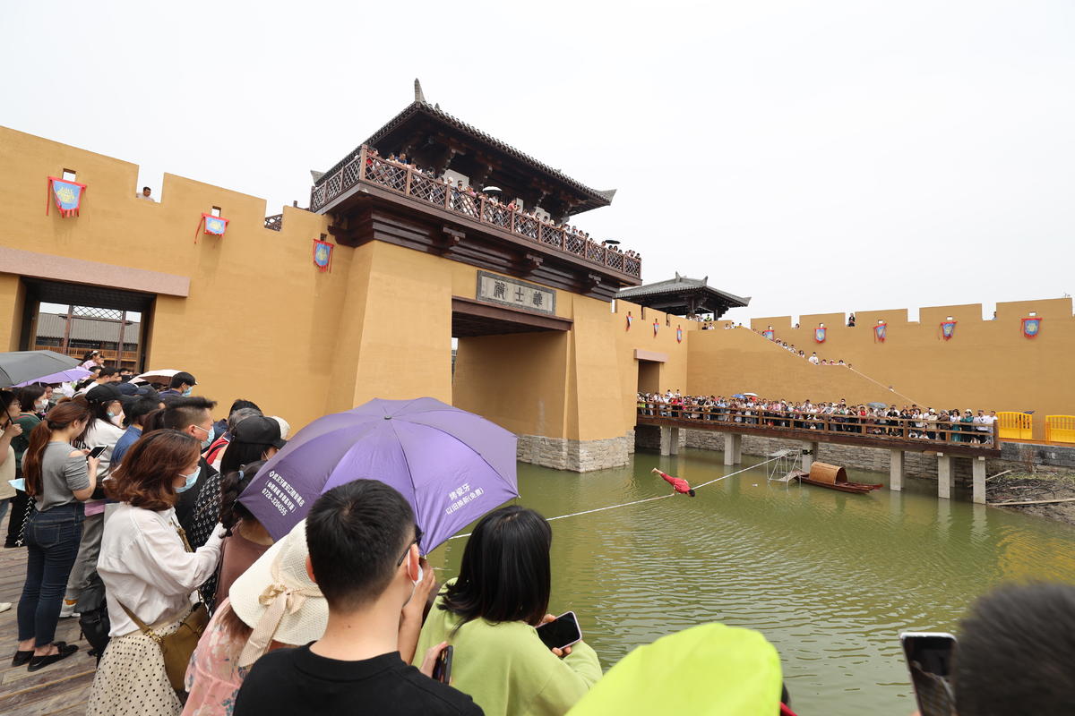 沔阳小镇的见南阁、进士殿、人意之心雕像、哇哦乐园、美食街等都是“出片儿”的打卡胜地,唐宋风格的建筑自带流量,好吃好玩的特色民俗也是游客的心头好。网红们也纷纷来这里直播,或是直播皮影戏、锅盔,或是在景区里跳舞、唱歌,让更多网友了解沔阳小镇。