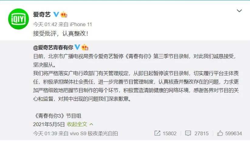 根据网络视听节目相关管理规定,北京市广播电视局责令爱奇艺暂停《青春有你》第三季节目录制。随后爱奇艺视频《青春有你3》栏目组发表声明,从即日起中止该综艺节目视频录制,对此诚恳接受,坚决服从。