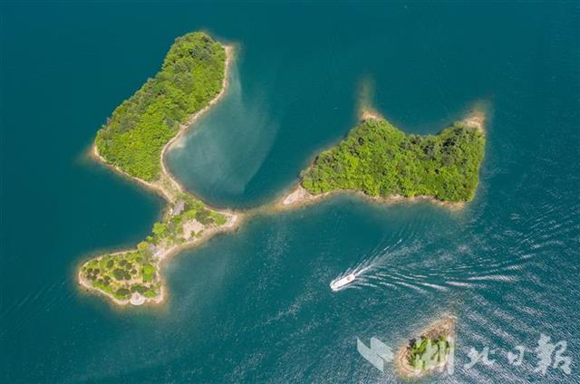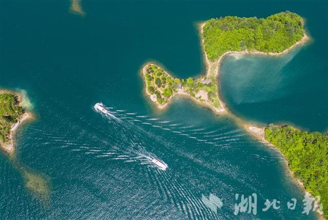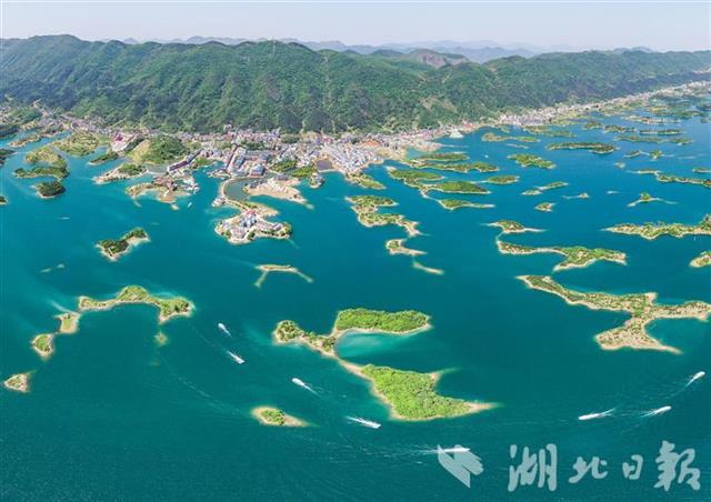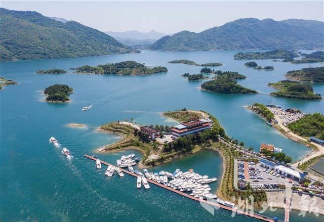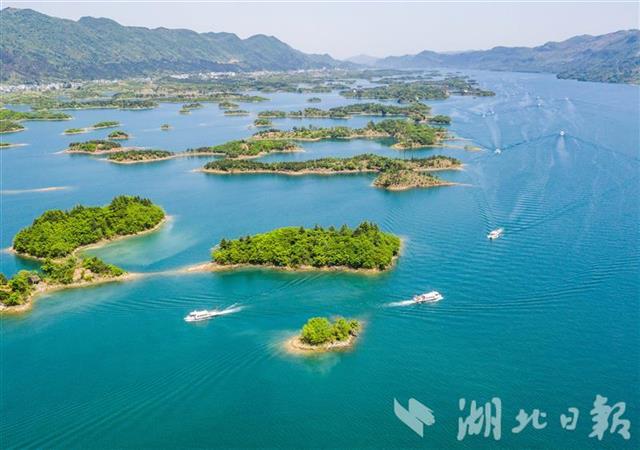 黄石阳新县王英镇仙岛湖景区,游船穿梭在碧波之上,截至5月5日下午5时,仙岛湖景区共接待游客5.5万余人。仙岛湖水面面积4.6万亩,湖中散布着大大小小千余座岛屿,自然风光旖旎。近年来,王英镇以绿色发展为指引,加强饮用水源地保护及河道治理,推动旅游发展和乡村振兴深度融合。“五一”小长假期间,景区游人如织,民宿和农家乐生意火爆。(湖北日报全媒记者 薛婷 通讯员 胡盼 戴璐 摄)