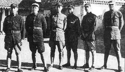 1936年11月,红一方面军部分指挥员在宁夏豫旺堡。左起:左权、彭德怀、聂荣臻、陈赓、孙毅、聂鹤亭
