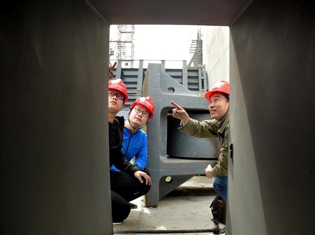 三人来到泄水闸第二联前,这里前些天开始安装闸门施工,眼下闸门支臂构件被运到现场,等待安装。谢爱华前后左右查看,连边边角角、旮旮旯旯的地方都不放过。“工程竣工后,闸门支臂经常在水中工作,防腐防锈很重要,这个支臂支座里面是球状,这种结构优点是传力可靠,转动性能良好,不仅承载能力强、水平位移大,而且能适应大转角的需要……”谢爱华现场为两个年轻人释疑解惑。平时图纸上不太容易看懂的结构物,经过谢总现场教导,两个年轻人茅塞顿开。
