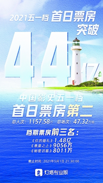 具体到五一档的单日表现,假期首日观众的观影热情最高。据灯塔专业版数据,2021年五一档首日票房超4.4亿,观影人次1157.58万,场次47.32万,为中国影史五一档首日票房第二(仅次于2019年的6亿)。