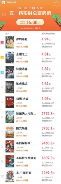 纵观目前各项数字,今年五一档票房呈稳步增长。首先是总票房,截至5月5日中午12:25:34,2021五一档总票房突破15.27亿,打破五一档票房、人次、场次三项影史最高纪录并持续刷新,其中总人次4034.22万,总场次225.31万。截至5月5日16点30分,五一档总票房已突破16亿元。