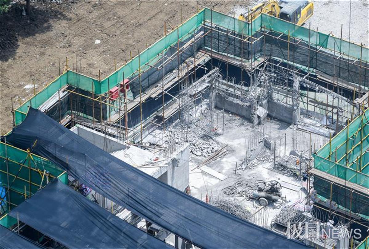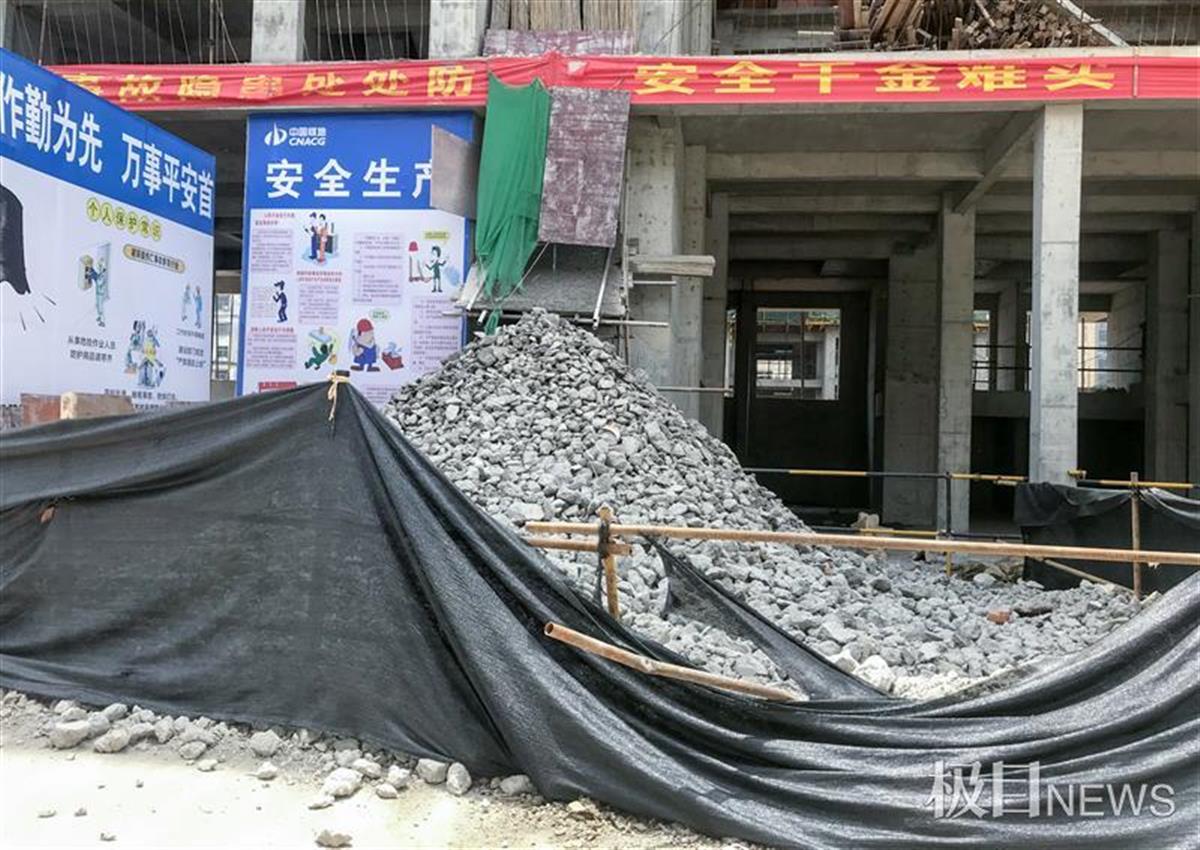 5月7日,极目新闻记者赶到汉川市的中煤湖北地质局集团有限公司丽景花园项目部,看到1号楼七楼的楼顶正在进行拆除扫尾工作,楼下还堆放着拆掉的混凝土废料。