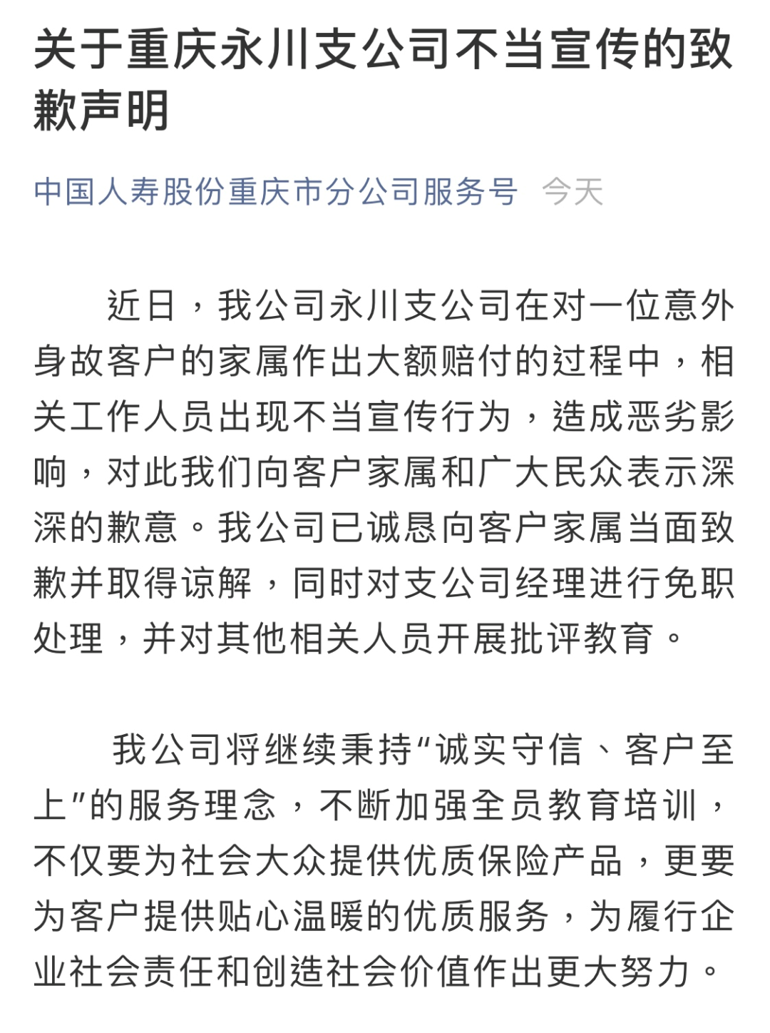 声明称,重庆市分公司永川支公司在对一位意外身故客户的家属作出大额赔付的过程中,相关工作人员出现不当宣传行为,造成恶劣影响,对此向客户家属和广大民众表示深深的歉意。