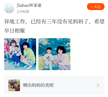 如今@JiahaoW家豪28岁了,在武汉工作,妈妈在广州工作,两人已经好几年没见面了,彼此非常想念。去年疫情防控期间,@JiahaoW家豪在武汉居家隔离,身在广州的妈妈非常担心,但又帮不上忙,只能每天打电话教他做菜,通过这样简单的方式关心着他。现在他说,希望以后能多点时间陪陪妈妈,以后再不让她操心了。