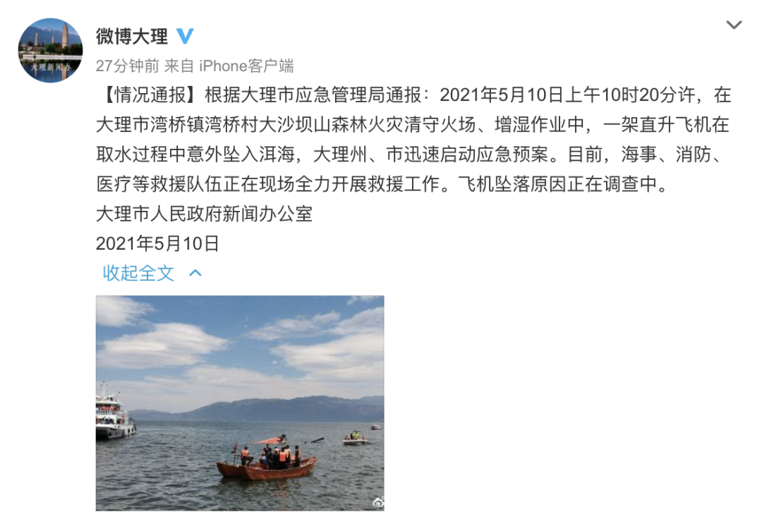 中共大理市委宣传部官方微博@微博大理 发布通报称,5月10日上午10时20分许,在大理市湾桥镇湾桥村大沙坝山森林火灾清守火场、增湿作业中,一架直升飞机在取水过程中意外坠入洱海,大理州、市迅速启动应急预案。