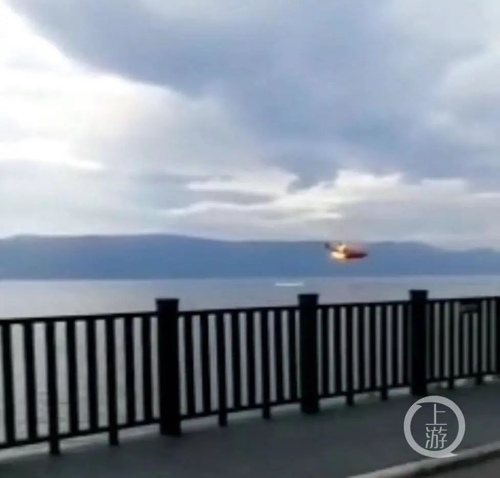 ▲直升机坠入洱海前尾部曾起火。图片来源/受访者供图