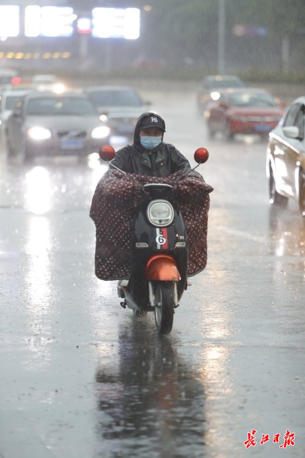 5月10日下午,武汉突降暴雨,骑车人在雨中赶路。长江日报记者杨涛 摄