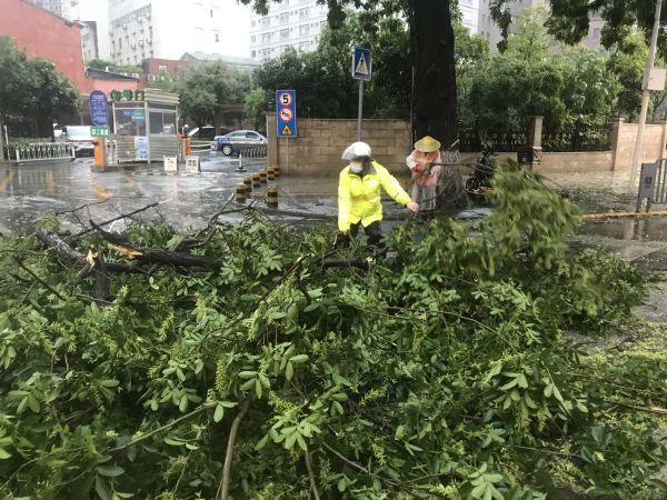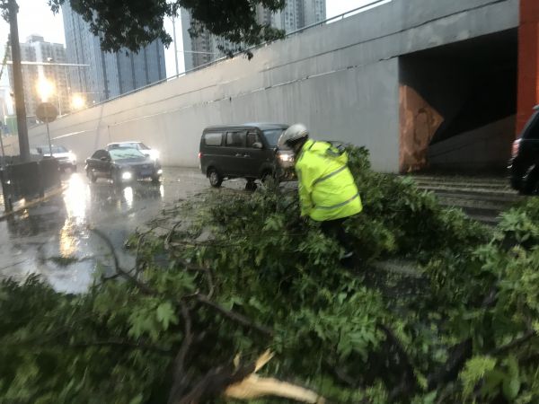 15时30分,江汉一桥旁边的武汉市四医院三号门门口,狂风暴雨将大树枝打断,挡住道路。硚口交通大队民警曾俊、李伟带领辅警金建、肖立学迅速赶到。他们一起把巨大的树枝拖到一边不影响交通的位置,然后疏散群众、指挥过往车辆安全通过。