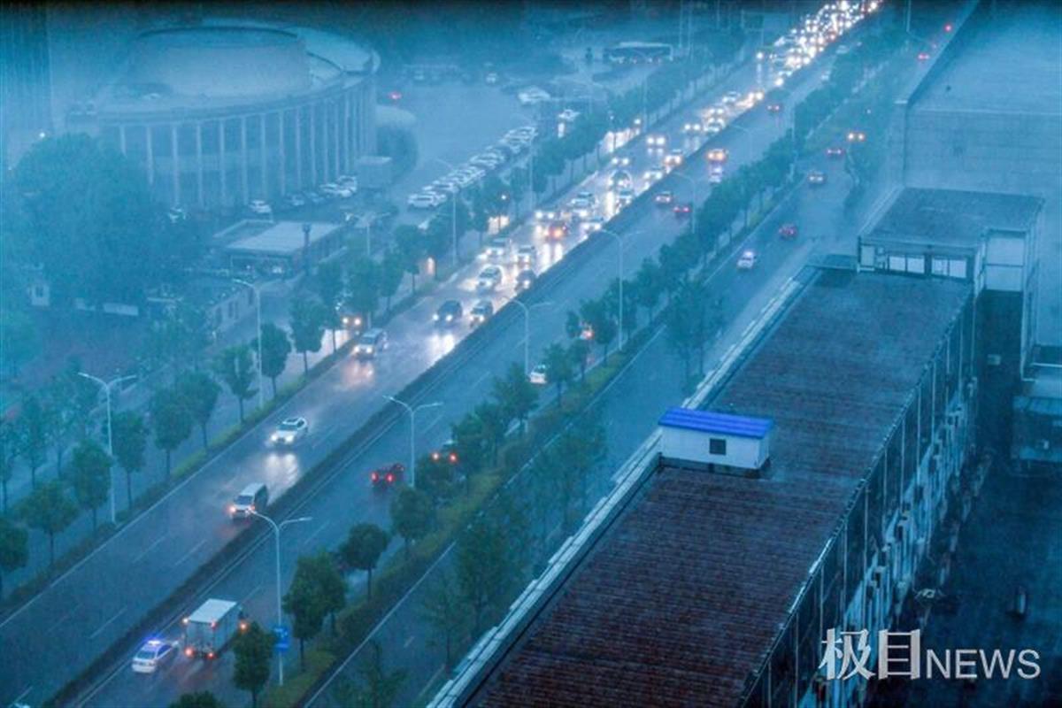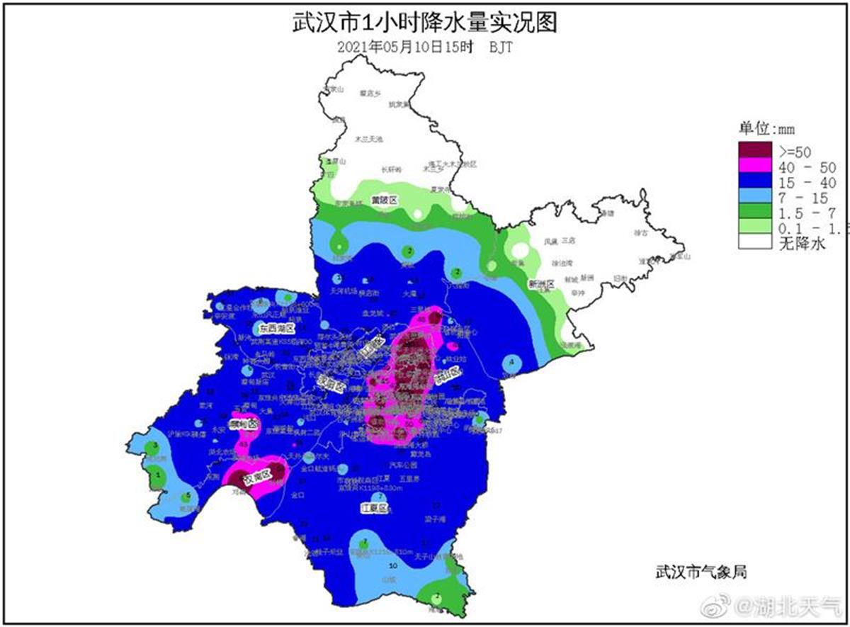 就像从高空砸落一个饱满的大水袋,14时-15时,武汉遭遇强降水突袭,位于东西湖国家级气象站显示这1小时雨量29.2毫米,但中心城区24个区域站1个小时降水量超过50毫米,位于东湖风景区的武汉科技大学城市学院1小时降水量达到99.6毫米,也就是说1天暴雨的量在1小时内豪泼完成(24小时降雨量≥50毫米就达到暴雨级别)。暴雨如注时,还有雷暴大风等强对流天气“添油加醋”。